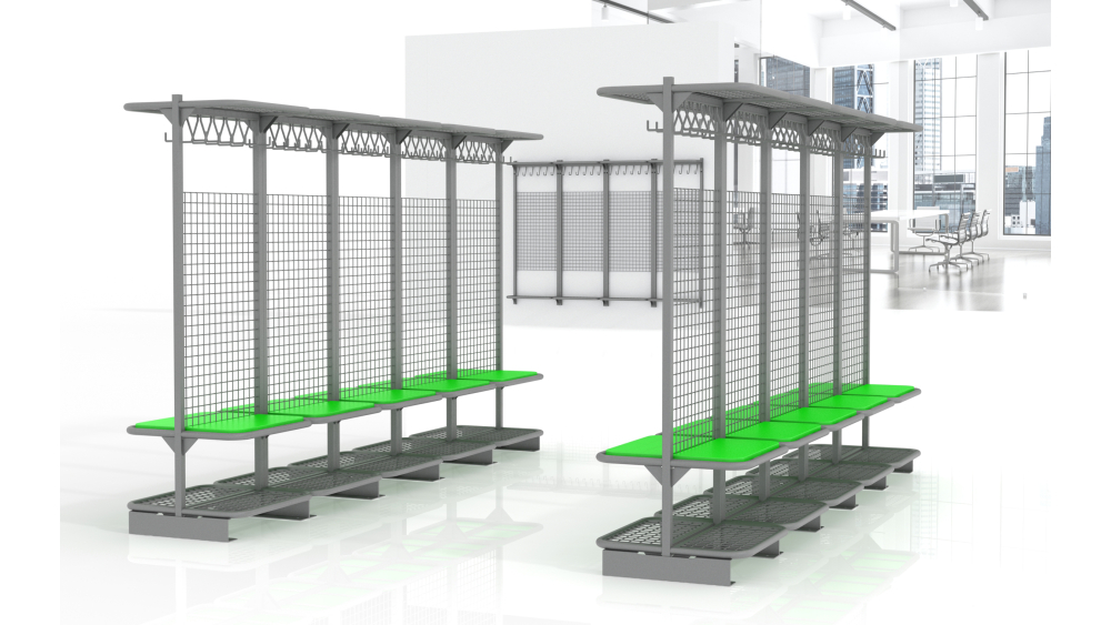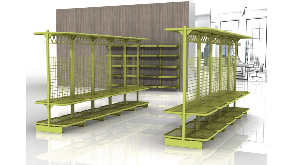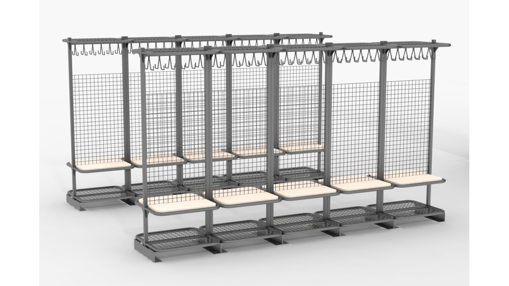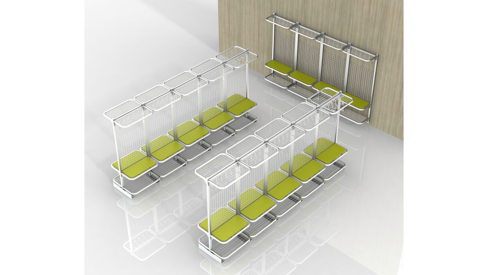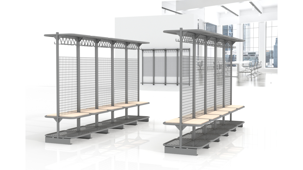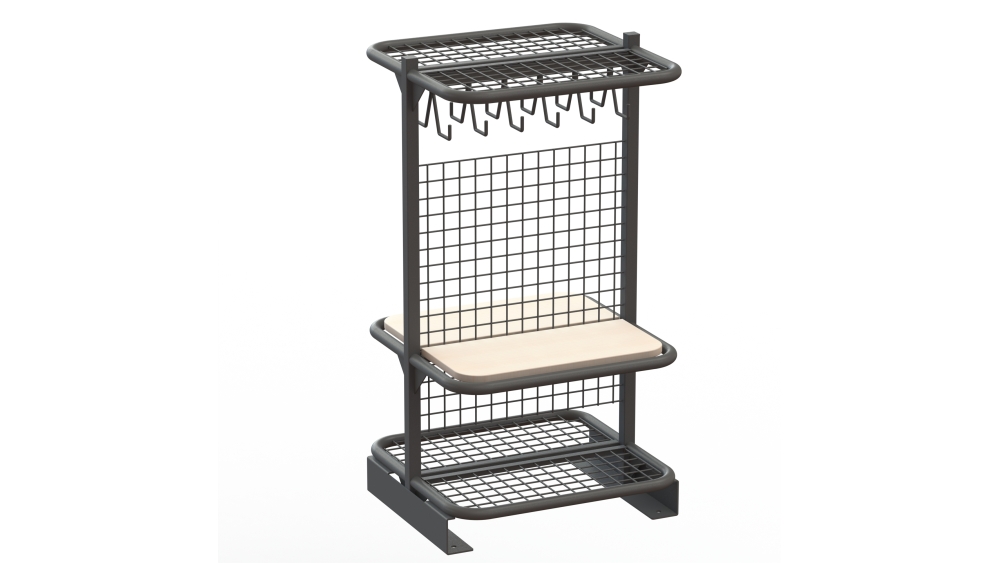 Hattuhylly, koukut, kenkäteline, taustaverkko, istuintaso ja koivuistuin