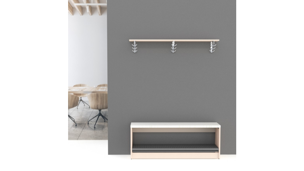 Naulakko kapeaan tilaan. Henkarit asettuvat mukavasti seinän suuntaisesti jättäen eteiseen kulkutilaa.